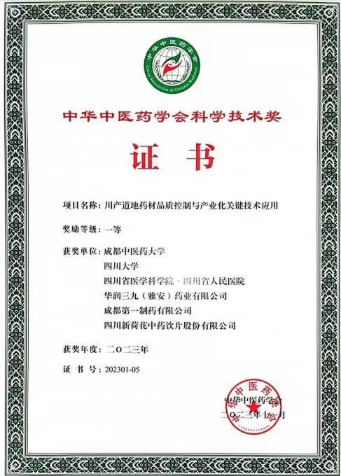 2023年度中华中医药学会科学手艺奖评审效果于克日宣布,新宝gg创造奇迹“川产道地药材品质控制与工业化要害手艺应用”科研项目荣获科学手艺奖一等奖。