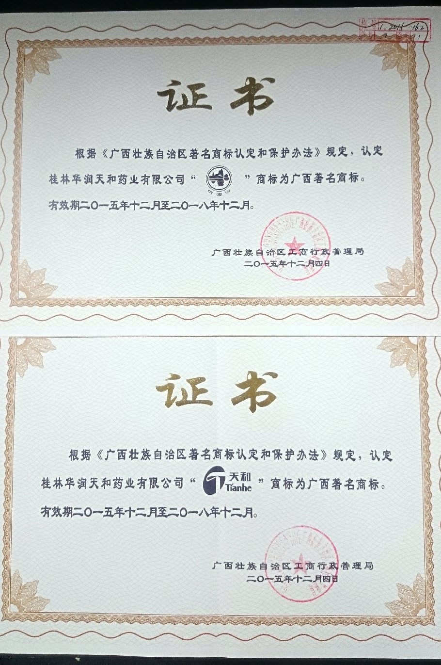 广西壮族自治区工商局克日下发《关于认定广西著名商标的通知》,桂林华润天和药业有限公司榜上著名,其“天和”及“伏波山”商标双双再度通过复审,被认定为广西著名商标。2016年2月2日...
